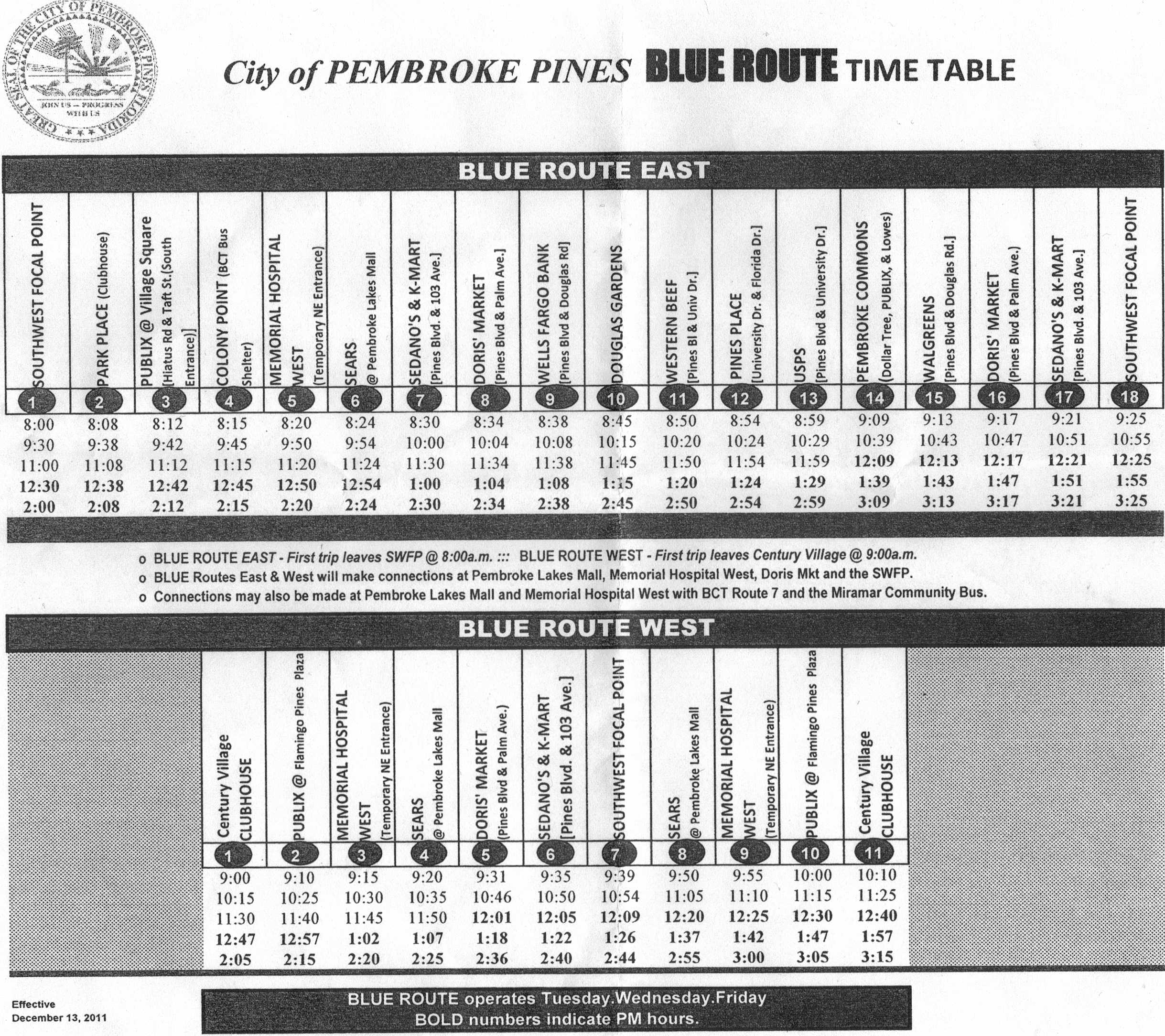 City of Pembroke Pines BLUE ROUTE TIMETABLE Blue Route operates Tuesday, Wednesday, Friday. Bold numbers incidate PM hou • Routes will make connections at Pembroke